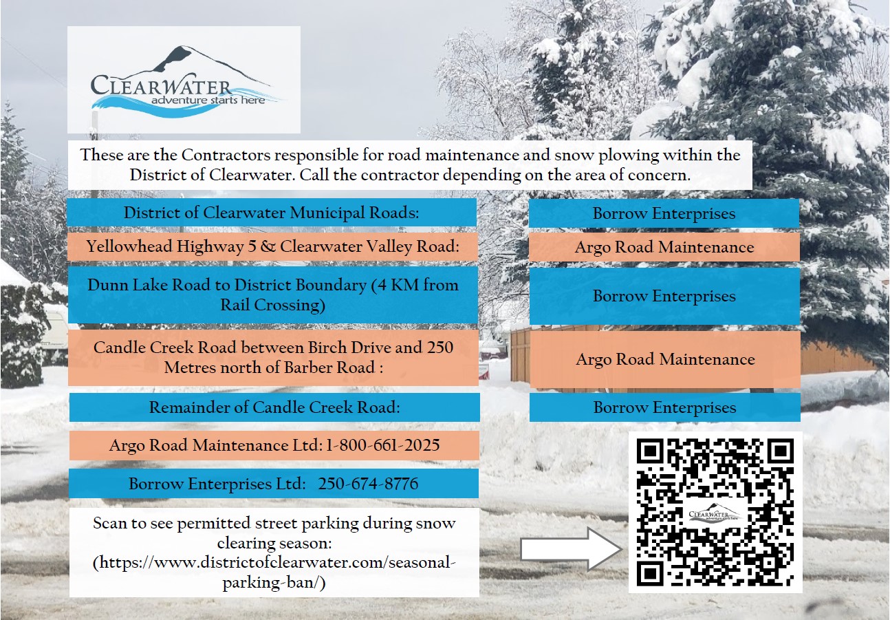 When the snow hits, we work hard to ensure that roads stay open and safe. The District of Clearwater contracts road maintenance for all municipal roads. Not all roads within the District boundary are the responsibility of the municipality. Some roads are managed by the Ministry of Transportation and Infrastructure who contracts roads maintenance to Argo. Call the contractor depending on your area to report issues that impede traffic e.g. trees across the road, items blocking the view. Please do not call to request windrow clearing in your driveway. After a snowfall event, please be patient and give the contractor time to clear the roads.